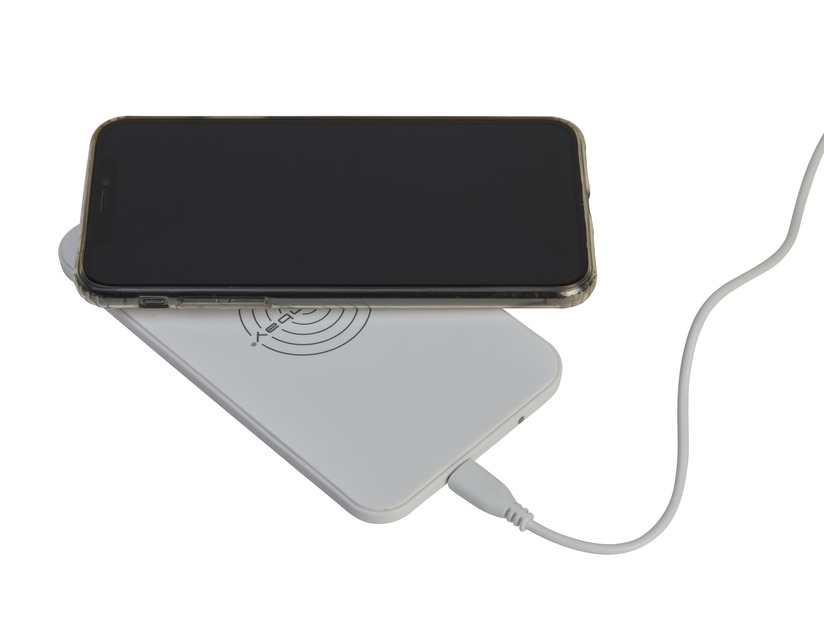 Induktivna namizna polnilna postaja Qi z napajanjem USB v črni ali beli barvi za uporabo doma ali v pisarni.