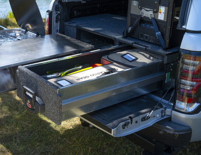 Predal za rolete nudi lahko dostopen, drsen in izvlečen prostor za shranjevanje. Priložena je valjčna plošča z ravno površino za pritrditev hladilnika z zamrzovalnikom, ki omogoča, da po potrebi zdrsne ven. Izdelan iz vodoodporne vezane pomorske vezane plošče z zaščitnimi prevlekami, ojačanimi z jeklom, za vrhunsko trdnost in obložen z UV-stabilno komercialno preprogo, ki dopolnjuje vašo notranjost. Lahko se uporablja v kombinaciji z drsno kuhinjo ARB, stranskim talnim kompletom ARB in sprednjim talnim kompletom ARB (na voljo posebej)