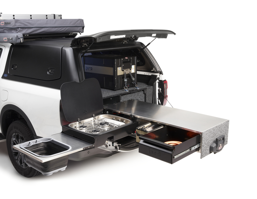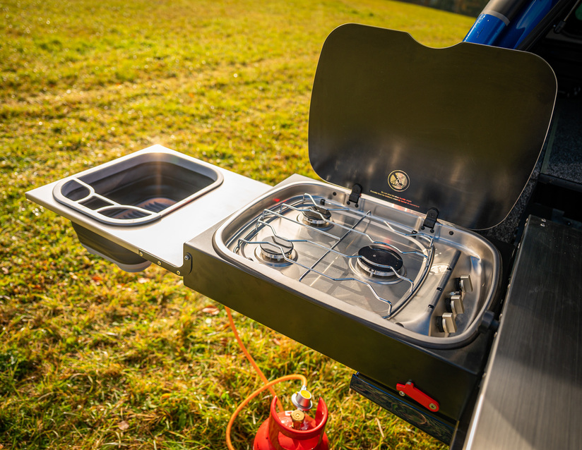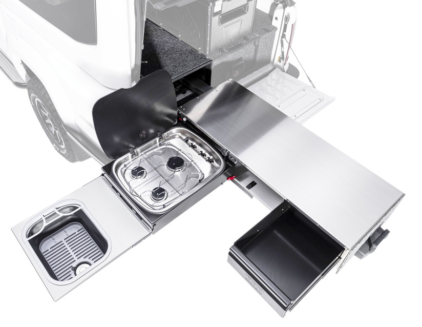 Drsna kuhinja je popolnoma praktična in večnamenska drsna kuhinja v modularnem predalnem okvirju 1355 mm. Ima integriran štedilnik, pomivalno korito, predal za posodo in delovno ploščo iz nerjavečega jekla in ga je mogoče postaviti ali zapakirati v samo 15 sekundah! Ko kuhinjo izvlečete, se štedilnik in pomivalno korito obrneta na levo stran, da ustvarite delovno površino v obliki črke L. Plinski štedilnik ima 3 gorilnike, vse v posodi iz nerjavečega jekla, ki je enostavna za čiščenje in zagotavlja zaščito pred vetrom , preklopni pokrov iz kaljenega stekla pa služi tudi kot zaščita pred škropljenjem med delovanjem peči. Delovna plošča iz nerjavečega jekla zagotavlja veliko površino za pripravo in serviranje hrane in je tudi zelo enostavna za čiščenje. Lahko se uporablja v kombinaciji z izvlečnim predalom ARB, kompletom ARB za stranska tla in kompletom za sprednja tla ARB (na voljo posebej)