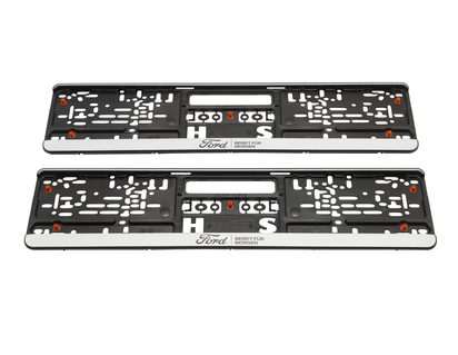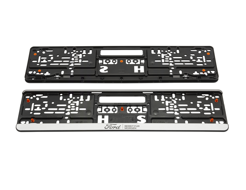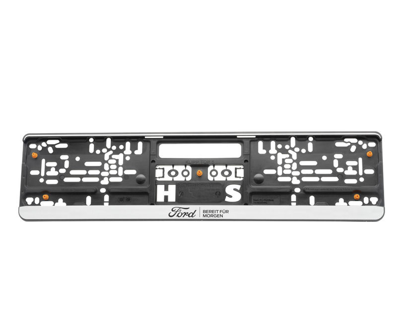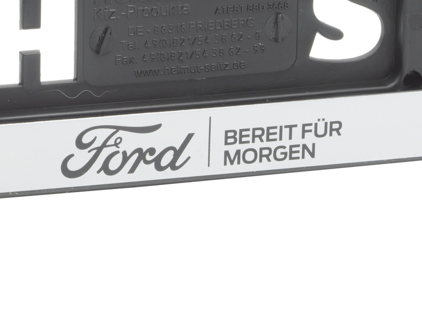 Fordovo držalo registrske tablice srebrno, s črnim Fordovim logotipom in črnim napisom »BEREIT FÜR MORGEN«