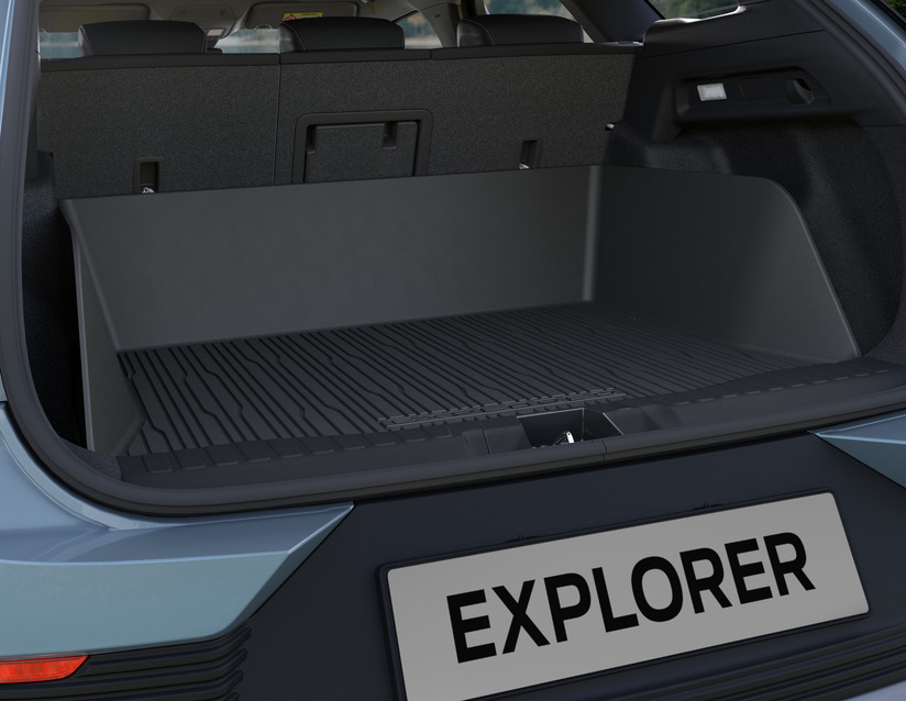 Popolnoma električni Explorer 03/2024, Korito prtljažnega prostora za zgornje dvojno prtljažno dno, z logotipom Explorerja, zadnji in bočni del višine 250 mm. Vključuje korito za drugi tovorni prostor za spodnja... Prikaži več