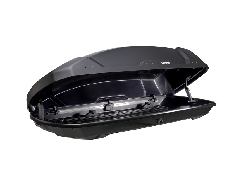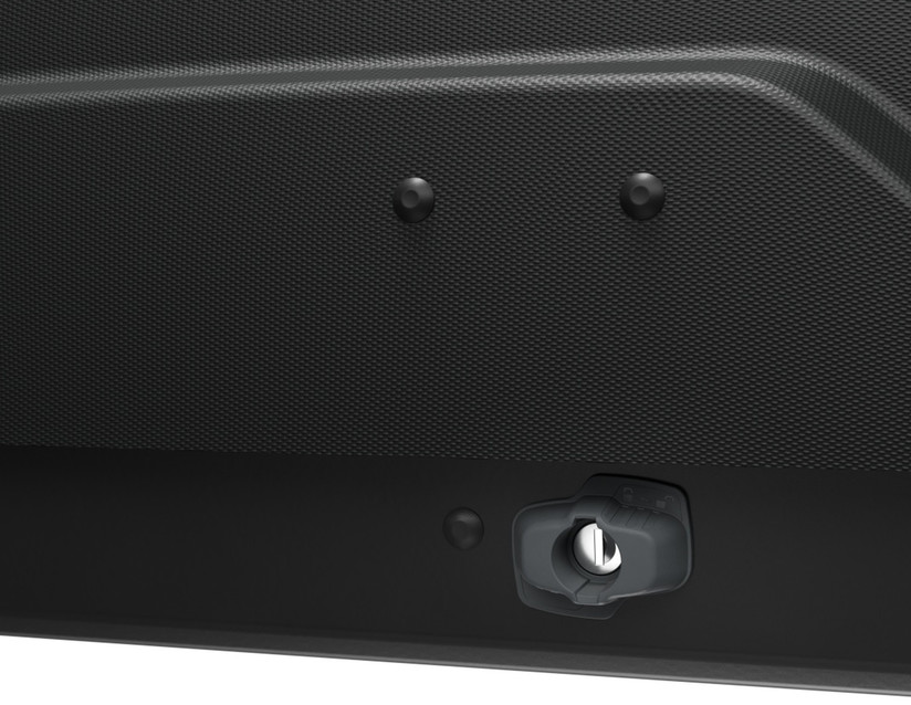 ko je pravilno nameščen, zagotavlja hitro in varno pritrditev. Priročno odpiranje in zapiranje zahvaljujoč ključavnici LockKnob, ki prav tako pomaga preprečiti poškodbe Thule® * Comfort Key. DualSide odprtina omogoča enostaven dostop do vseh delov škatle s katere koli strani vozila. Upoštevajte, da se lahko strešni kovčki, odvisno od modela vozila, previsijo in povzročijo, da se strešni kovček pri odpiranju dotika prtljažnih vrat