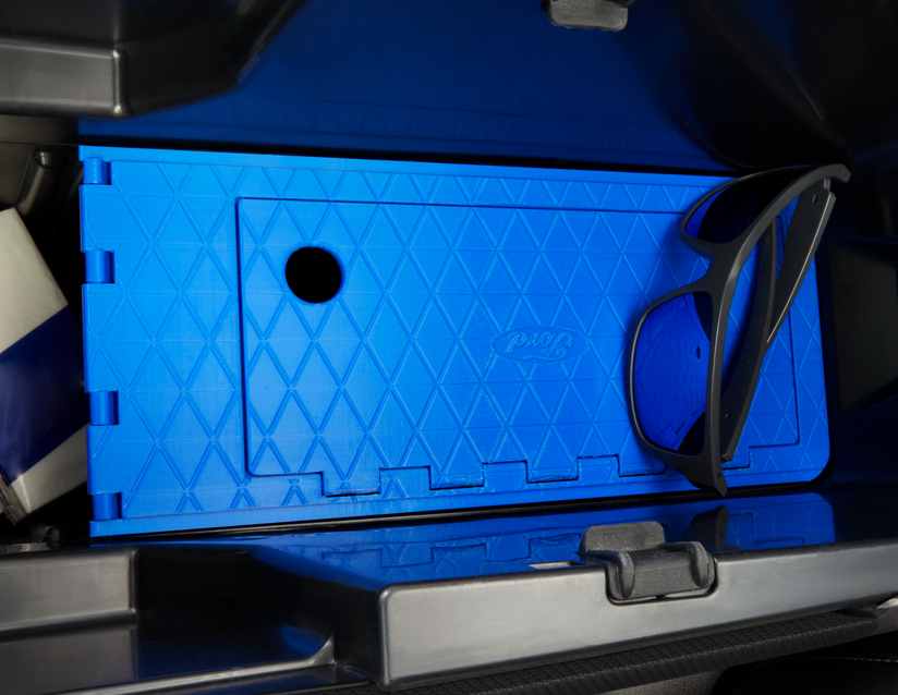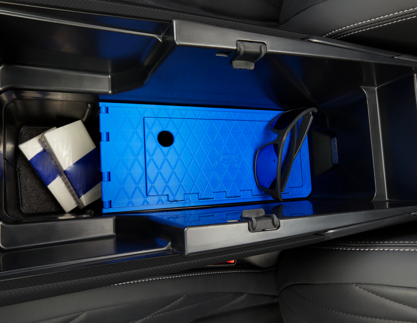 Se vam zdi, da globina sredinske konzole novega povsem električnega Explorerja še ni v celoti izkoriščena? Večnamenski razdelilnik, ki ga je mogoče natisniti v 3D, dodaja drugi nivo odlagalnemu prostoru z loputo za odpiranje in dostop do spodnjega prostora. Ko je zaprt, zagotavlja zaprt prostor, ki ni takoj viden in pomaga ohranjati vaše dragocenosti na varnem.